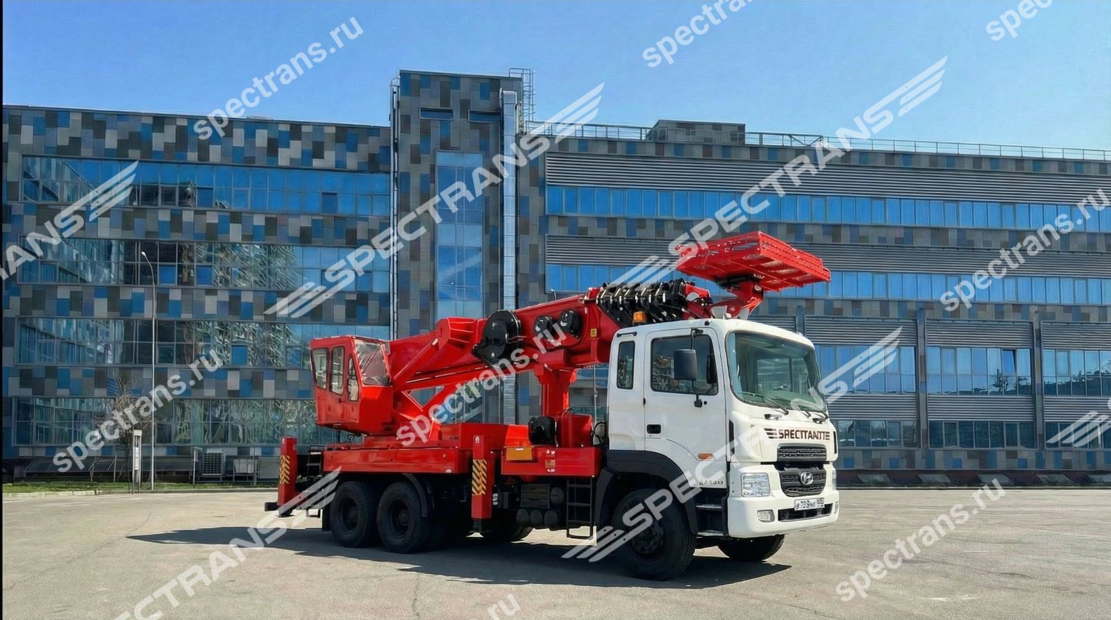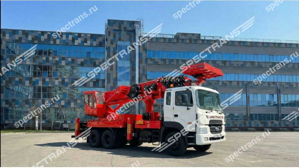 Автовышка позволяет выполнять работы на высоте до 55 метров с грузоподъемность 300 кг. Оснащена полноповоротной люлькой с функцией управления установкой как из машины, так и с выносного пульта. Данная установка - промышленный, очень маневренный подъемный механизм, предназначенный для выполнения широкого спектра работ. Преимущество её в том, что четырех-секционная телескопическая стрела позволяет точно и аккуратно производить работы по краям зданий и сооружений.