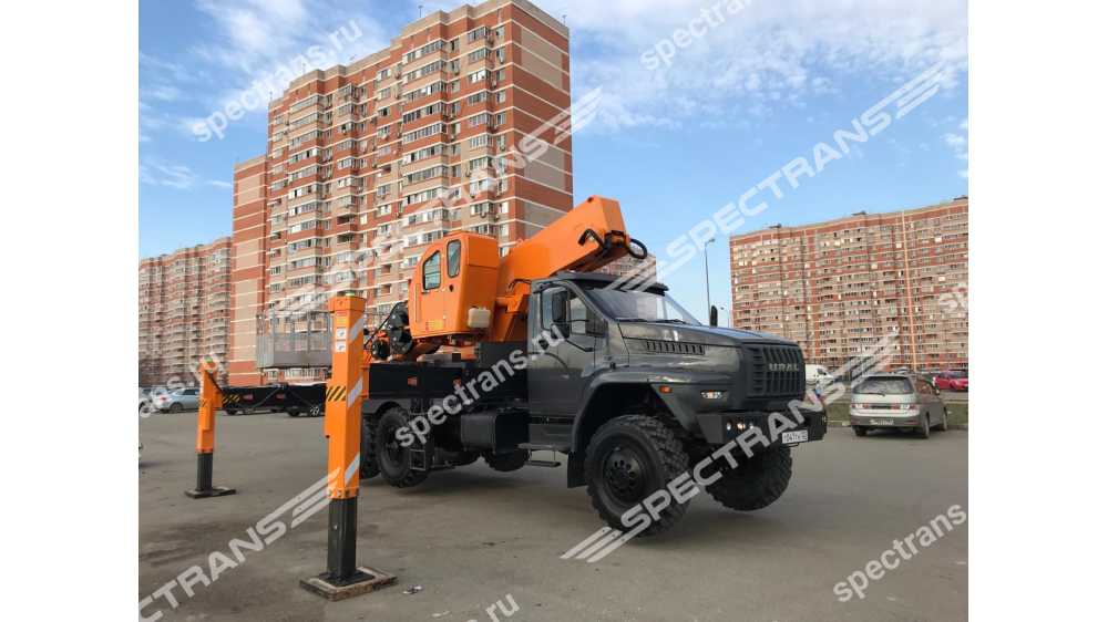 Автогидроподъемник на полноприводном шасси повышенной проходимости на базе URAL NEXT 6x6. Предназначена для работ на высоте в труднодоступных и труднопроходимых местах, таких как лесополосы, заболоченная местность и строительные объекты.
